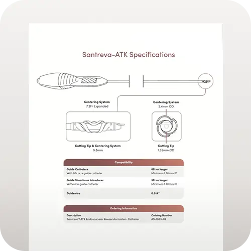 Enabled by Atheroplasty™ Innovation, the Santreva™-ATK Endovascular Revascularization Catheter simultaneously combines mechanisms to revascularize severely occluded arteries, including chronic total occlusions (CTOs), simplifying one of the most complex procedures in cardiovascular interventions.